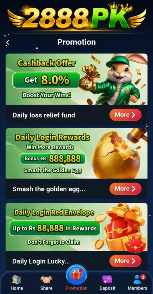 2888 Pk Game is a daily-based, non-stop cash-earning app. Where users can play simple games such as Slot, Fish, Poker, live sports betting, and lottery. Try it to earn real cash rewards with a simple daily login, deposit, or refer link share task. Fast cashout with local wallets such as easypaisa, jazzcash, and for kega transactions also use bank transfer.